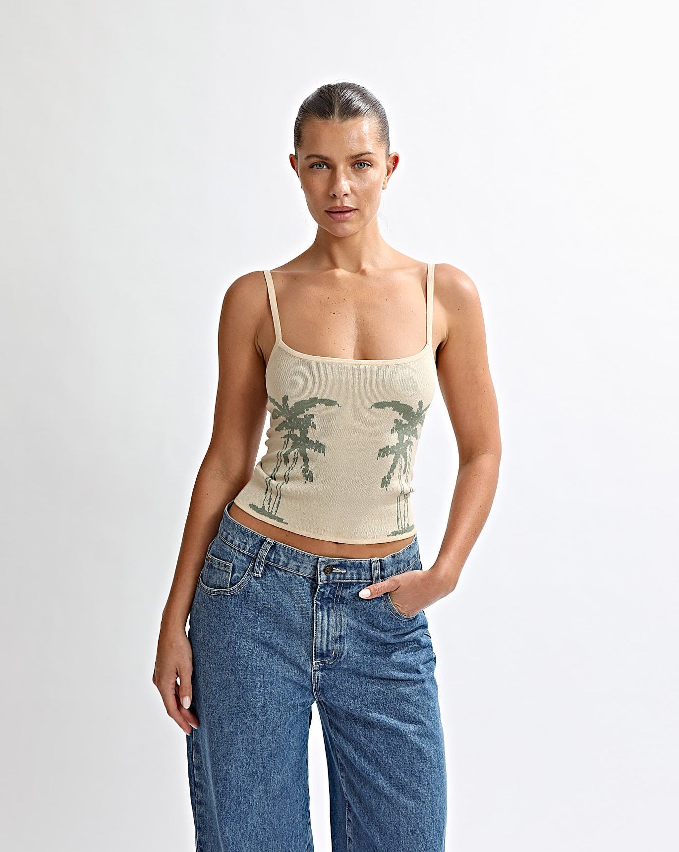 Knit cami top with narrow straps and our Cali palm motif in a contrasted colour