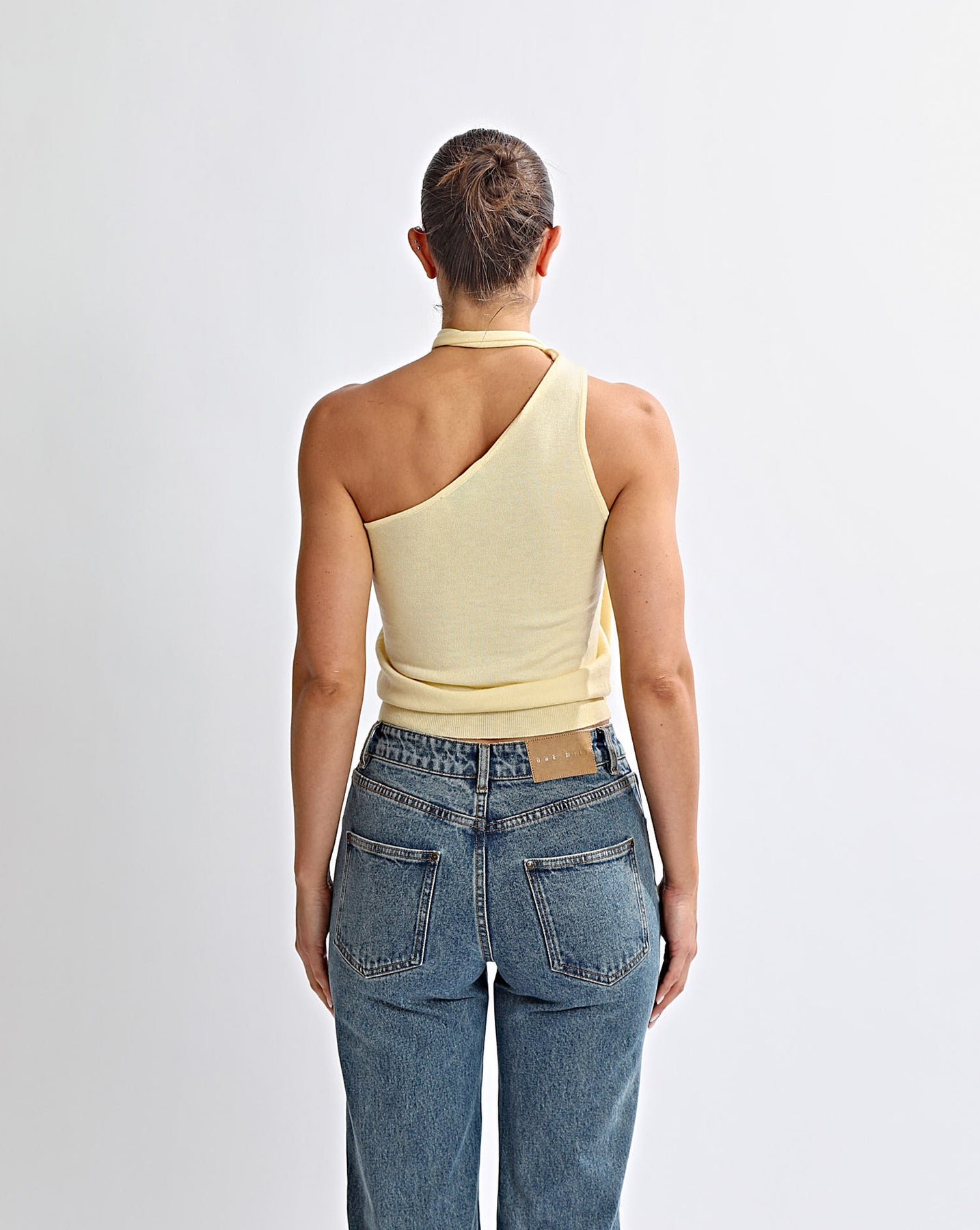 One shoulder knit top with scarf attatched at shoulder seam to be wrapped around the neck