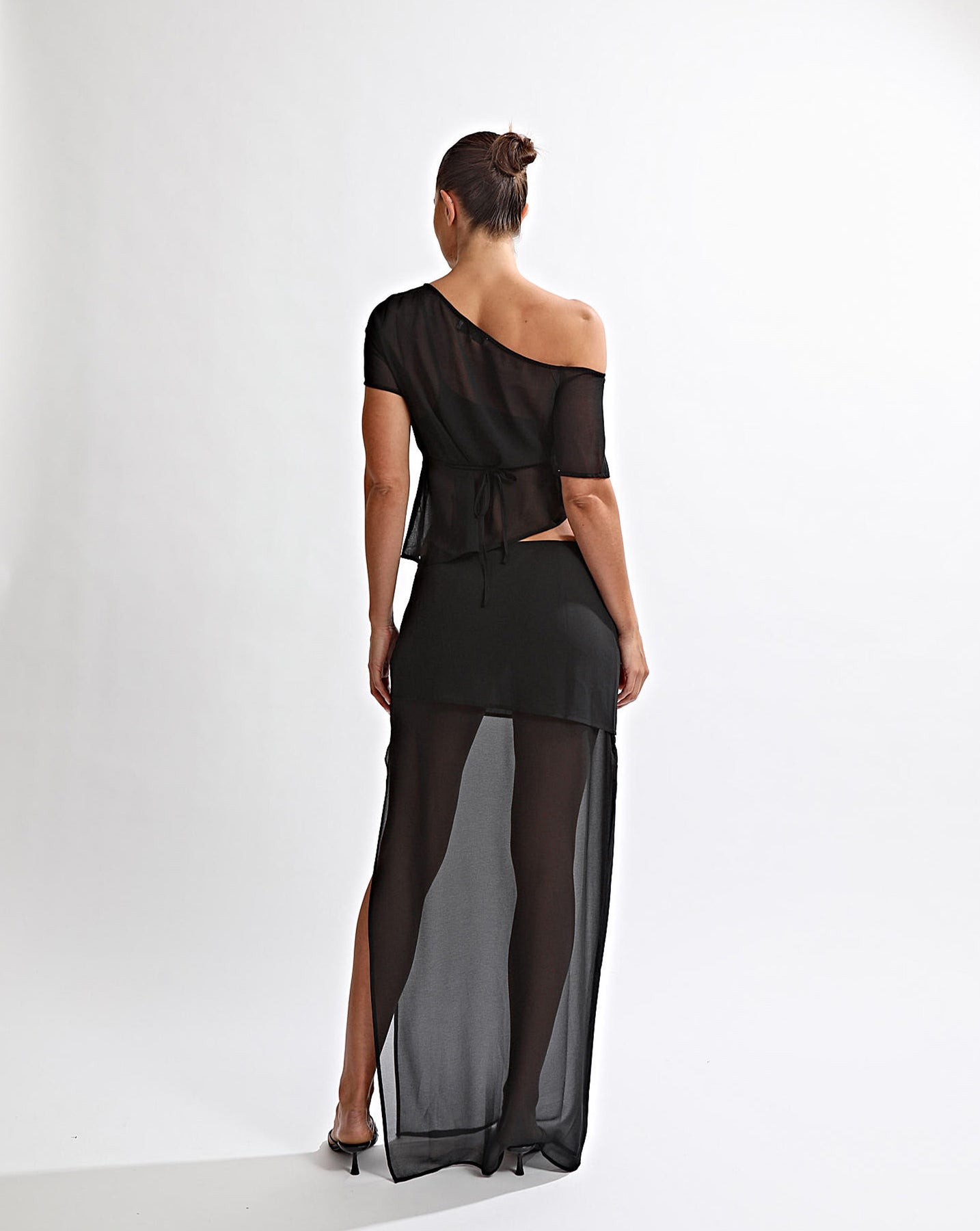 Sheer, asymmetrical skirt designed with a mid rise waist and fluid drape full length style skirt featuring a clean waistband and side seam split for ease of movement