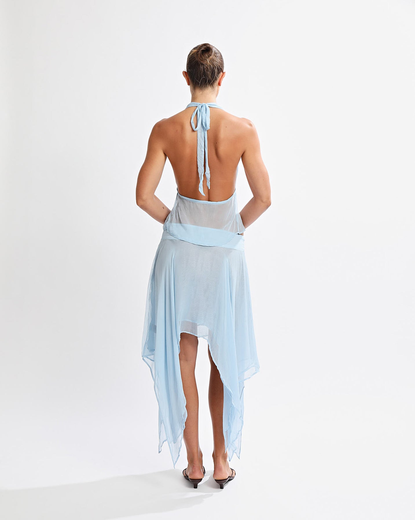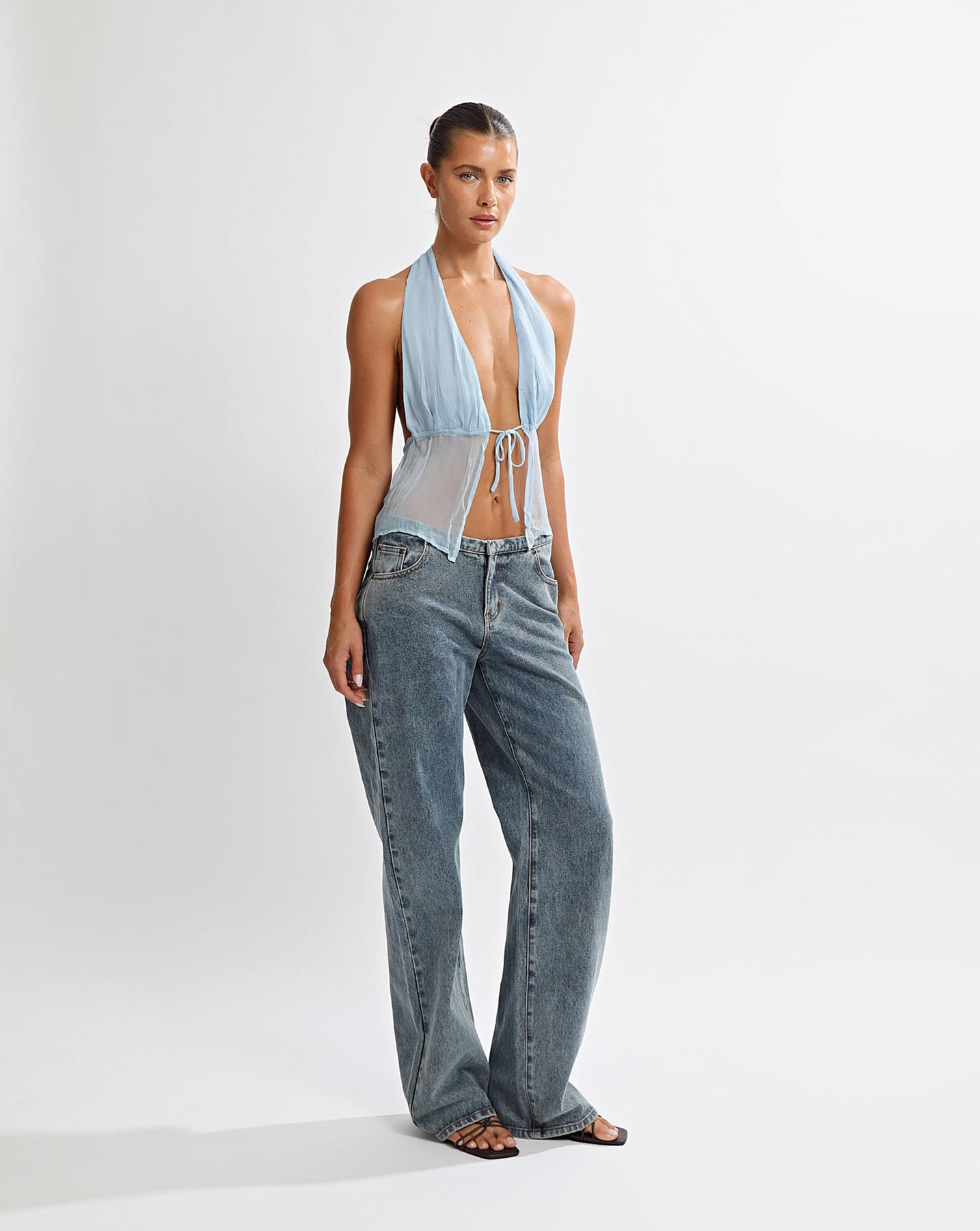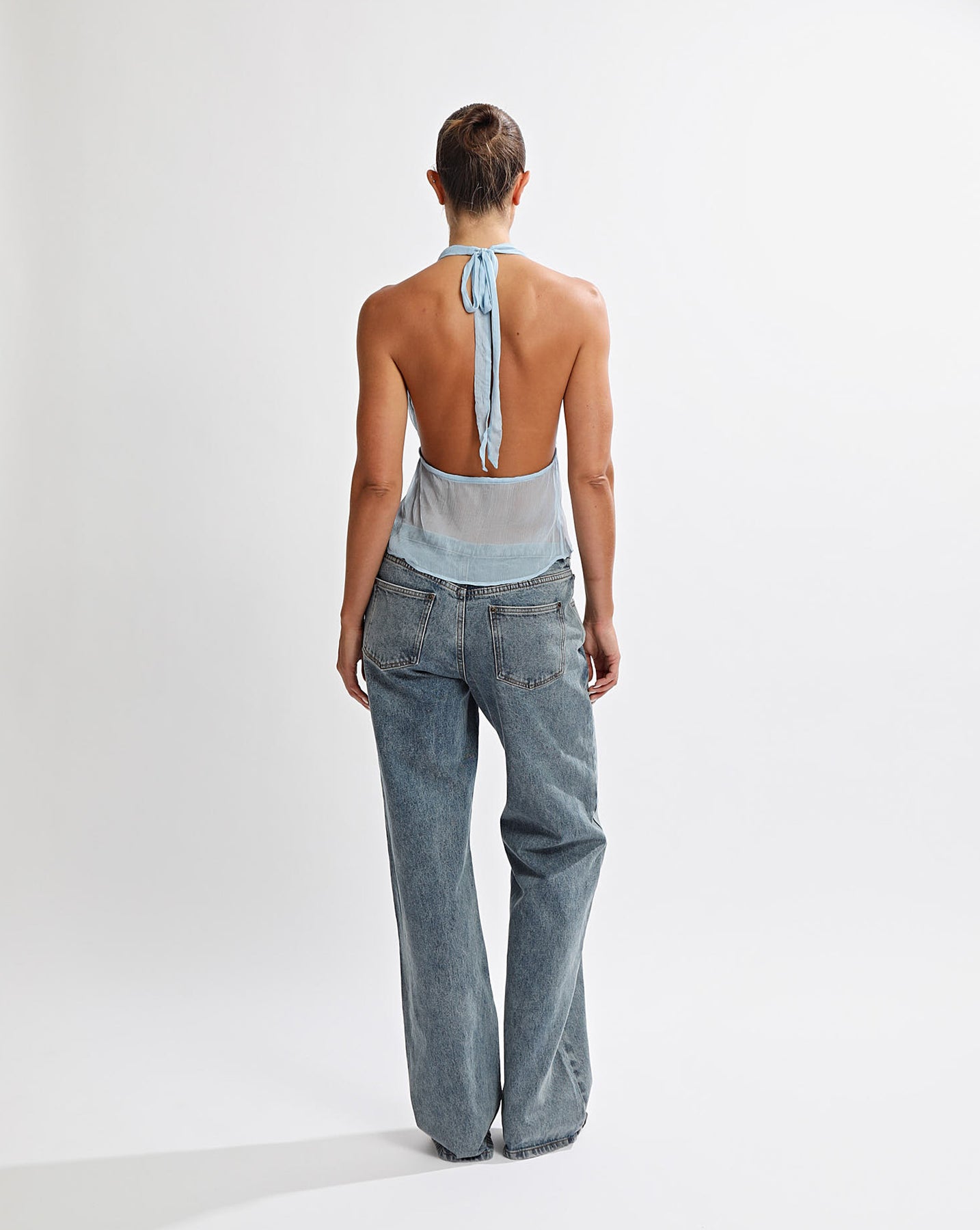 Halter style top with drawstring closure in centre front