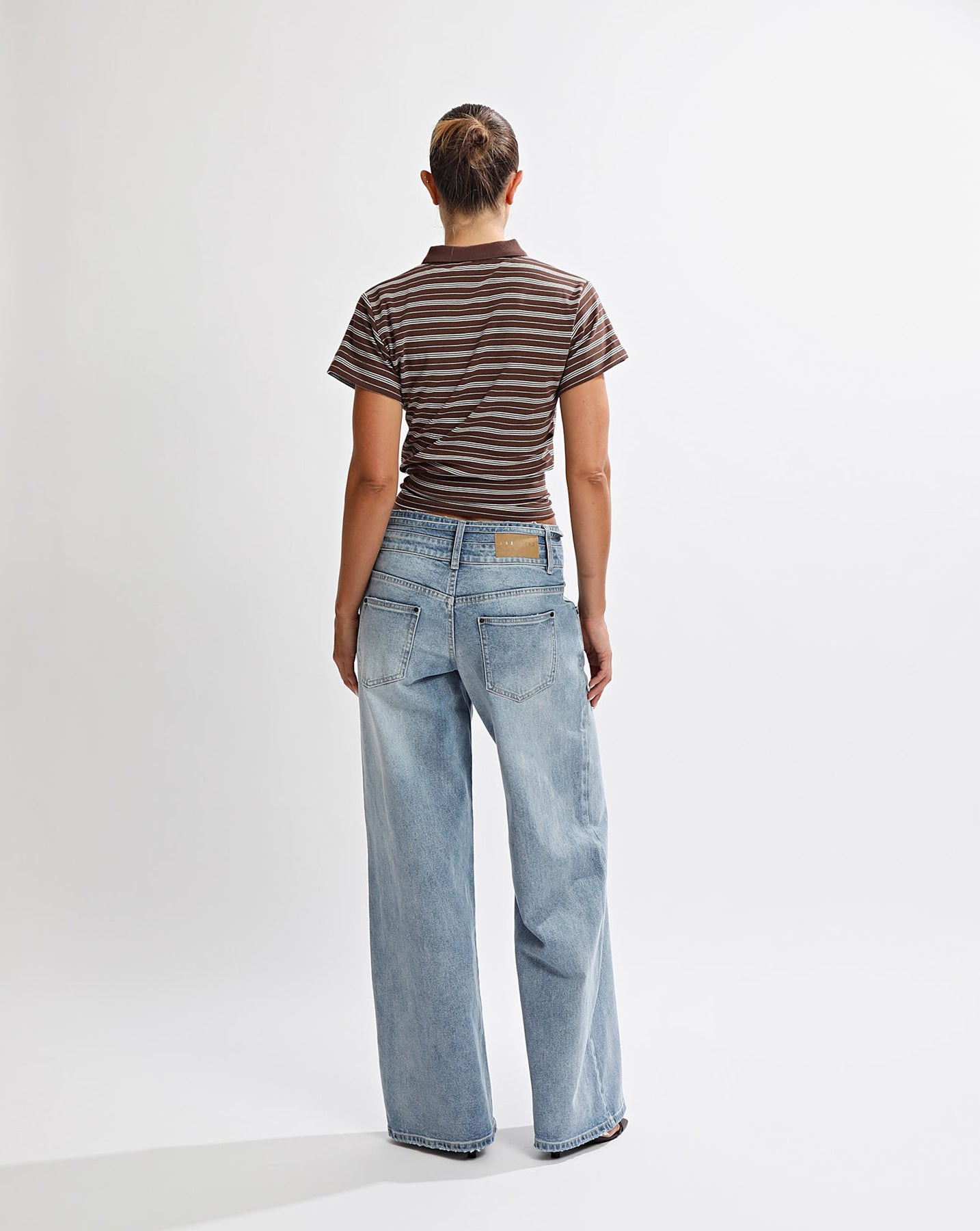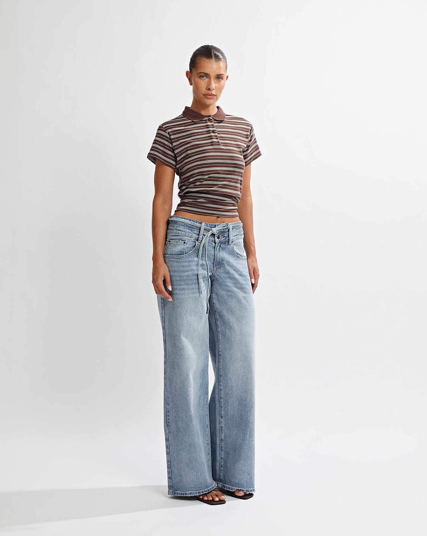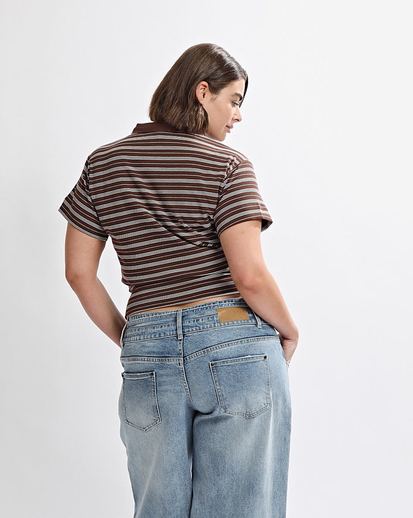 Contrast collared top with a cinched hem creating a flattering fit