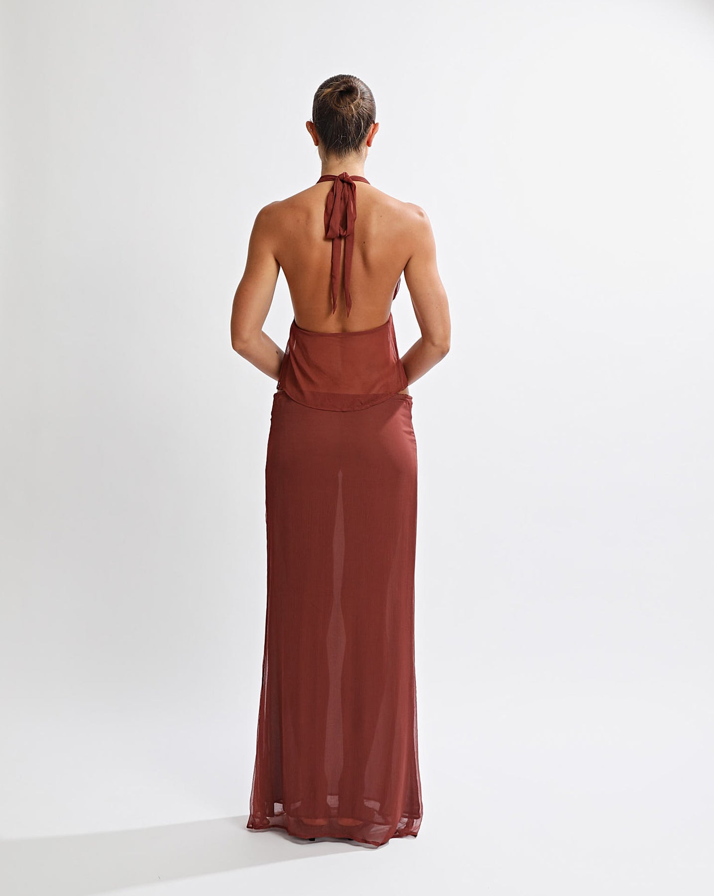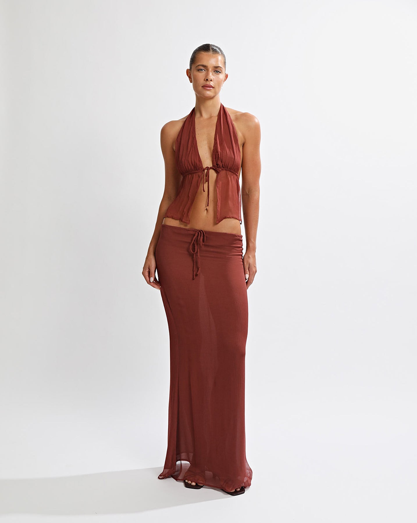 Mid waist maxi length skirt with drawstring tie at centre front