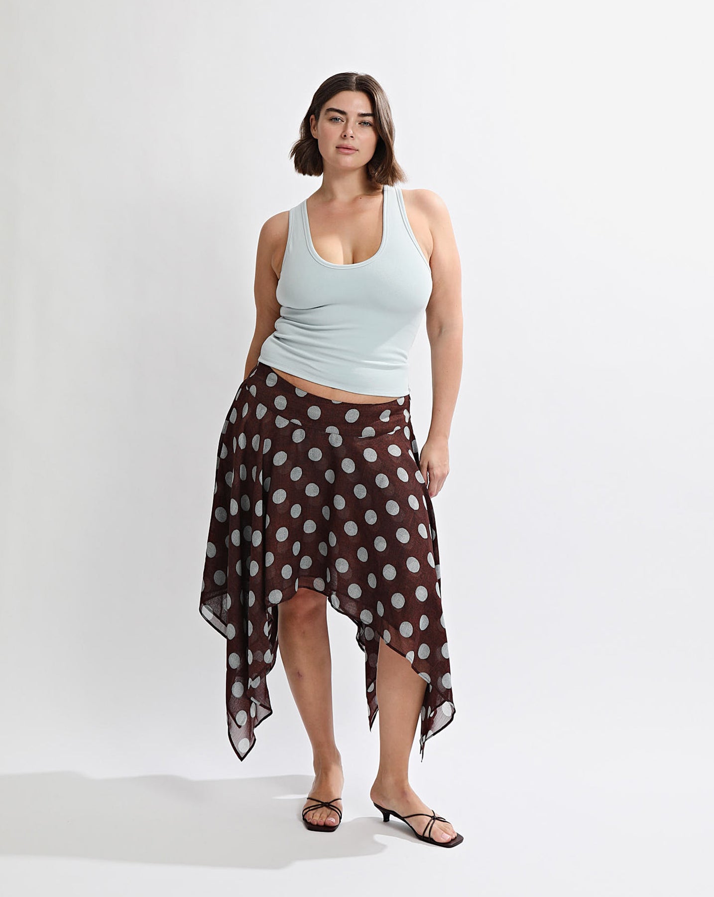 Mid-low waist midi length skirt with asymmetrical hem and zipper on left side seam